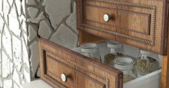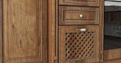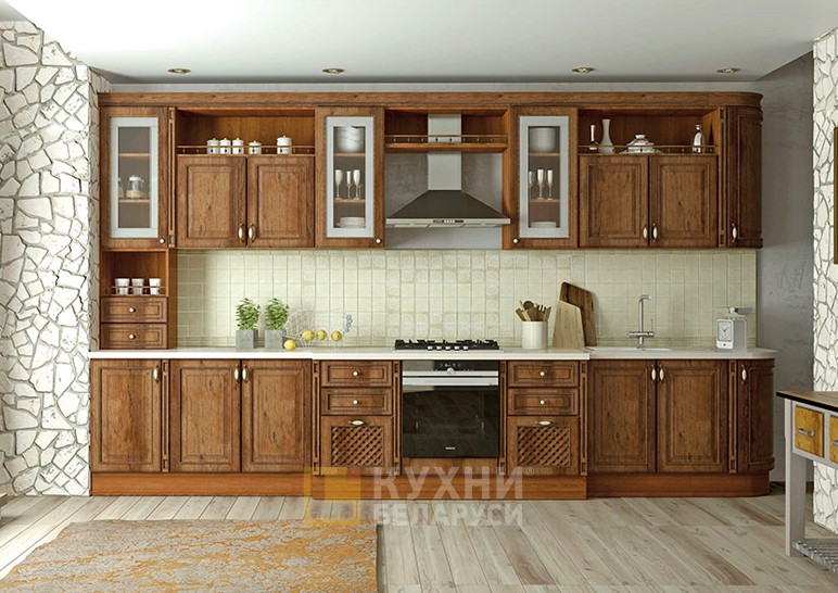 Прямой, с большим количеством выдвижных и раскрывающихся ящичков, выполненный под дерево (пленка ПВХ), этот гарнитур кажется воплощением консервативности и сдержанности. Такая мебель останется актуальной и десятилетия спустя.