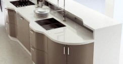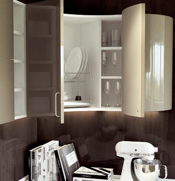 Кухонный гарнитур необычной выгнутой формы станет украшением вашего дома, а, кроме того, решит сразу несколько практических вопросов: компактное размещение, простора уборки, удобная система хранения.